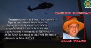 Pues, era el sucesor de su madre, alias Celeste, detenida en agosto de 2024 en San Pablo (Bolívar) por concierto para delinquir. Con orden de captura vigente por el mismo delito, expedida en noviembre de 2024 por el Juzgado Penal Municipal con Funciones de Control de Garantías de Cartagena, el cabecilla controlaba actividades ligadas a la producción y tráfico de estupefacientes, además del cobro de extorsiones. Estos crímenes atemorizaban a la población de los municipios de San Pablo, San Martín de Loba, Río Viejo, Alto del Rosario, el Arenal, Morales y Barranco de Loba, donde operaba el señalado actor armado.