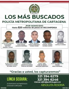 Ante ello, hoy la Policía Metropolitana de Cartagena dio a conocer el cartel de los más buscados, integrado por 9 presuntos delincuentes, que son requeridos por los delitos homicidio, concierto para delinquir agravado, porte ilegal de armas de fuego, lesiones personales y tráfico de estupefacientes.